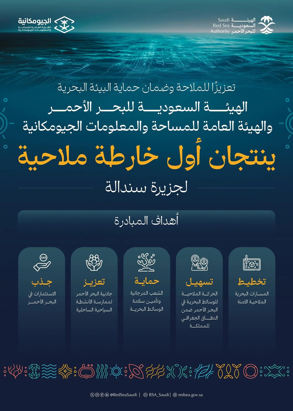 قامت الهيئة السعودية للبحر الأحمر بالتعاون مع الهيئة العامة للمساحة والمعلومات الجيومكانية، بإنتاج أول خارطة بحرية ملاحية بشقيها الورقي والإلكتروني عالي الدقة لجزيرة سندالة في منطقة نيوم، وبأحدث المعايير العالمية وفق معايير المنظمة الهيدروغرافية الدولية (IHO)، بالإضافة إلى أربعة خرائط أخرى لمنطقة نيوم.