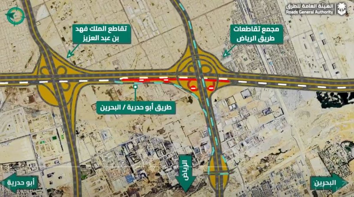 قالت الهيئة العامة الطرق، إنه ابتداء من يوم غد الإثنين، سيتم البدء باستكمال أعمال التحويلة المرورية على طريق أبو حدرية من تقاطع طريق الملك فهد إلى مجمع كباري طريق الرياض باتجاه الجنوب.