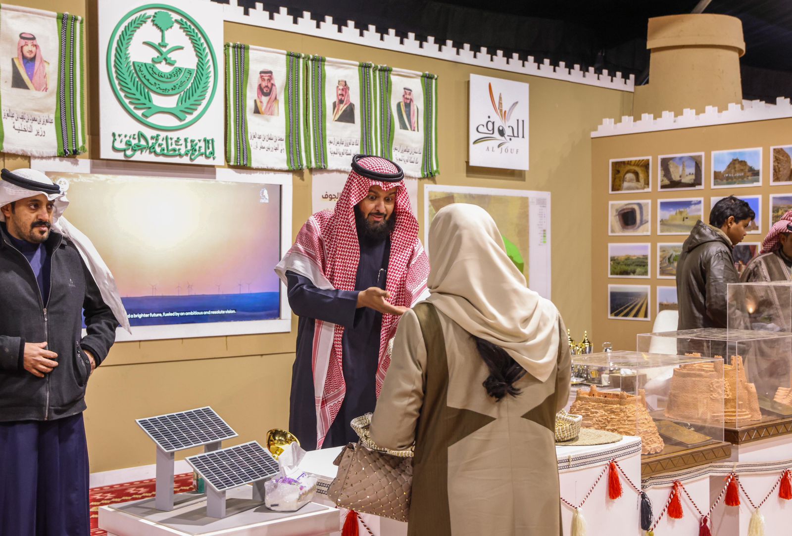 وسيحظى زوار جناح الإمارة بالتعرف إلى أبرز الأماكن الأثرية والسياحية والحرف اليدوية والتراثية ومنها السدو، والمنتجات الزراعية وأبرزها زراعة الزيتون، التي تشتهر بها المنطقة، ومشاهدة أفلام وثائقية للمشاريع التنموية، وعرض فنون الجوف الشعبية المتمثل في العرضة والسامري والربابة، وكذلك التعرف على الصور السياحية المتنوعة، والمواقع الأثرية التي تزخر بها، كما سيتعرف الزائر على مشروعات الطاقة المتجددة ومشروع الطاقة الشمسية وطاقة الرياح بالمنطقة، وكذلك إنتاج السمح وتذوق طبق البكيلة الرسمي لمنطقة الجوف .