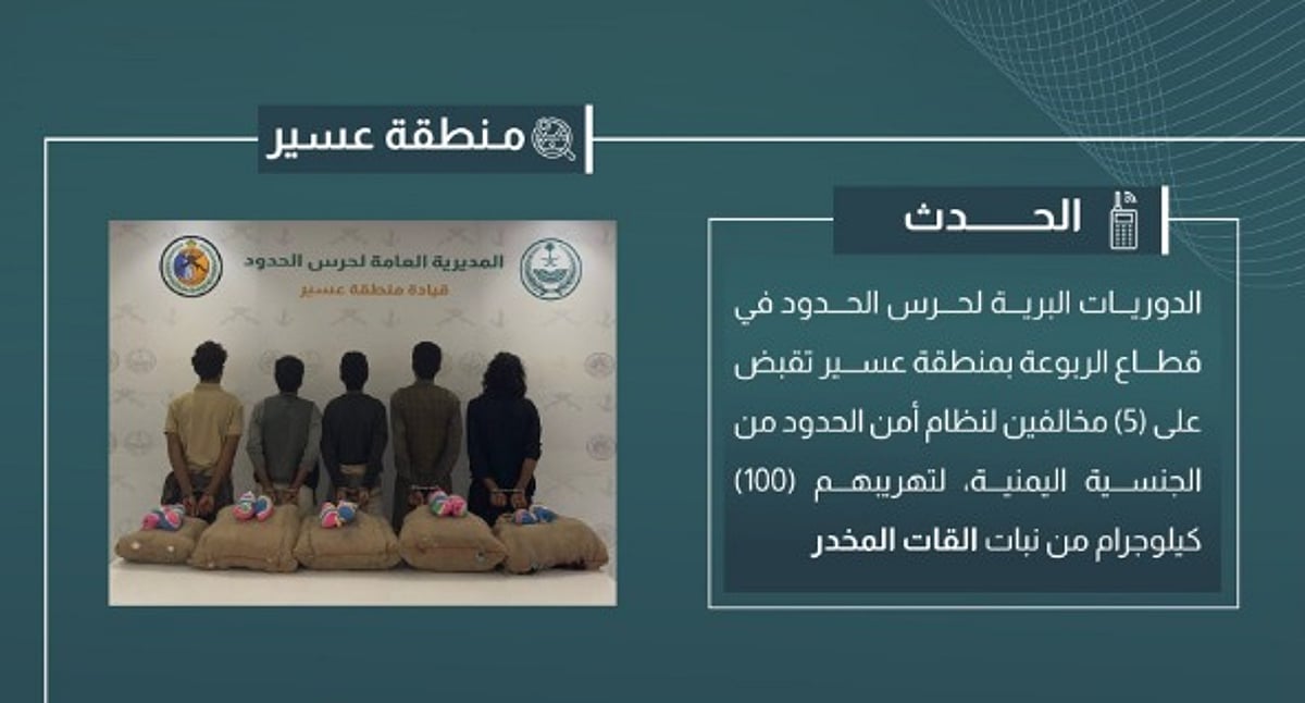 أعلنت الدوريات البرية لحرس الحدود في قطاع الربوعة بمنطقة عسير، القبض على (5) مخالفين لنظام أمن الحدود من الجنسية اليمنية؛ لتهريبهم (100) كيلوجرام من نبات القات