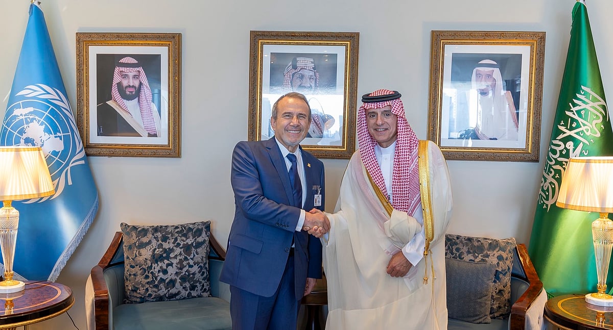 التقى وزير الدولة للشؤون الخارجية عضو مجلس الوزراء ومبعوث شؤون المناخ عادل بن أحمد الجبير، في نيويورك اليوم، وزير خارجية جمهورية البيرو السيد إلمر شيالر سالسيدو، وذلك على هامش أعمال الجمعية العامة للأمم المتحدة في دورتها الثمانين.